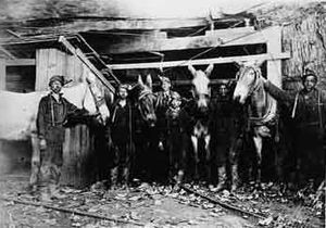 قبل مَيكْنة عمليات التعدين وإلغاء تشغيل الأطفال في المناجم، كان الصبية والبغال مصدرين مهمين للعمالة في المناجم. وتظهر الصورة أعلاه منجمًا في بنسلفانيا في الولايات المتحدة الأمريكية في أواخر القرن التاسع عشر الميلادي.