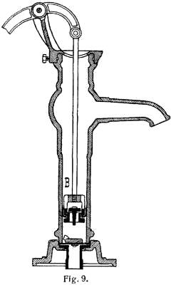 This shallow water well pump reduces atmospheric air pressure inside the pump chamber. Atmospheric pressure extends down into the well, and forces water up the pipe into the pump to balance the reduced pressure. Above-ground pump chambers are only effective to a depth of approximately 9 meters due to the water column weight balancing the atmospheric pressure.