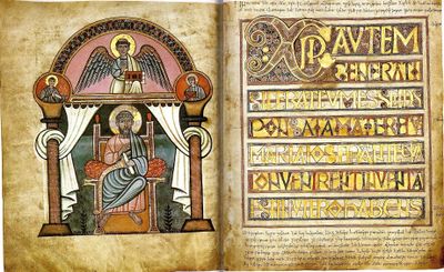 The evangelist portrait and Incipit to Matthew from the Stockholm Codex Aureus, one of the "Tiberius group", show the Northumbrian Insular and classicising continental styles that combined and competed in early Anglo-Saxon manuscripts.