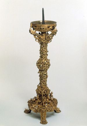 ولم يكن الذين يعملون في المعادن أقل شأناً من العاملين في الخشب. فقد كانوا يصنعون الحديد المشغول الرشيق للنوافذ، والأفنية، والأبواب الخارجية، والمفصلات قوية تمتد في عرض الأبواب الضخمة ذات أشكال نباتية متنوعة (كالتي نشاهدها في كنيسة نتردام NotreDame في باريس)، وكان ما يصنع منه لمقاعد المرنمين في الكنائس الكبرى "صلباً الحديد" ورقيقاً، كالمخرمات. وكان الحديد،أو البرونز، أو النحاس يصهر أو يطرق لتصنع منه أجمل المزهريات والقدور، والأباريق، والماثلات، والمباخر، والعلب، والمصابيح، وكانت صفائح البرنز تغطي كثيراً من أبواب الكنائس. وكان صناع الأسلحة يحبون أن يضعوا شيئاً من الزينة على السيوف وأغمادها، والخوذ، والتروس والدروع، وحسبنا شاهدأً على مقدرة صناع المعادن الألمان الثريا البرنزية الضخمة التي أهداها فردريك الثاني لكنيسة آخن الكبرى، وعلى مقدرة أمثالهم الإنجليز المائلة البرنزية الضخمة (المصنوعة حوالي 1100) المنقولة من جلوستر Gloucester والمحفوظة في متحف فكتوريا وألبرت Victoria and Albert Museum، وإن ولع صناع العصور الوسطى بأن يجعلوا من أبسط الأدوات تحفاً فنية ليتجلى في مزاليج الأبواب، وأقفالها ومفاتيحها، وحتى دوارات الهواء نفسها قد عنوا بزخرفتها بالنقوش الجميلة التي لا تستطيع رؤيتها إلا بالمرقب.