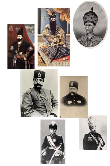 «القاجاريون»، الصف الأول العلوي (من اليمين إلى اليسار): أغا محمد شاه، فتح علي شاه، محمد شاه قاجار. الصف الثاني (من اليسار إلى اليمين): ناصر الدين شاه، مظفر الدين شاه. الصف الثالث (من اليمين إلى اليسار): محمد علي شاه، أحمد شاه قاجار.