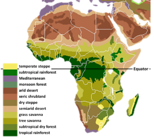 يتنوع المناخ في أفريقيا ما بين المناخ الإستوائي ومناخ المناطق شبه القطبية على أعلى قمم الجبال.ويتسم الجزء الشمالي من القارة بأنه يتكون بشكل أساسي من صحراء ومناطق القاحلة، في حين أن المناطق الوسطى والجنوبية على حد سواء، تغطيها سهول السافانا والأحراش الكثيفة (غزيرة الأمطار).وبين هذا وذاك، هناك مناطق متوسطة، حيث تنمو أنماط الحياة النباتية، مثل منطقة الساحل، والمناطق التي تسيطر عليها السهول.