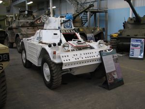 United Nations peacekeeping light armed mechanised vehicle in Bovington tank museum, Dorset, إنگلترة.