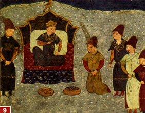 وفي وسط هذا السرير الأعظم مرتبة يجلس بها السلطان والخاتون الكبرى. وعن يمينه مرتبة جلست عليها بنته آيت كججك ومعها الخاتون أردجا. وعن يساره مرتبة جلست عليها الخاتون بيلون ومعها الخاتون كبك. ونصب عن يمين السرير كرسي قعد عليه تين بك ولد السلطان. ونصب عن شماله كرسي قعد عليه جان بك ولده الاثني. ونصبت كراسي عن اليمين والشمال جلس فوقها أبناء الملوك والأمراء الكبار، ثم الأمراء الصغار مثل إمرأة هزارة. وهم الذين يقودون الفا. ثم أتى بالطعام على مائد الذهب والفضة. وكل مائدة يحملها أربعة رجال أو أكثر من ذلك.