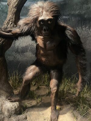 Australopithecus afarensis model at the Smithsonian National Museum of Natural History. This reconstruction depicts the facultative bipedalism hypothesis, indicated by the use of the tree for stabilization.