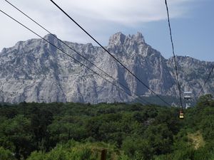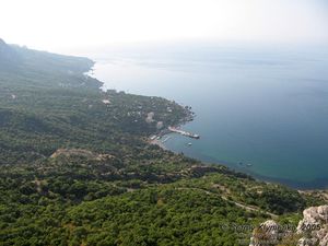 الساحل الجنوبي يمتد لمسافة 8–12 كيلومتر (5.0–7.5 mi) من البحر حتى السلسلة الجبلية الموازية، جبال القرم.[42] هذه الجبال توجد خلفها سلسلة موازية ثانوية. 75% من المنطقة المتبقية من القرم تتألف من أراضي رعي شبه قاحلة، سهوب پونتيك الممتدة جنوباً، تنحدر برفق من الشمال الغربي لسفح جبال القرم. السلسلة الرئيسية لهذه الجبال ترتفع بطريقة متناقضة مع القاع العميق للبحر الأسود التي يصل إرتفاعها إلى 600–750 متر (1،969–2،461 ft)، بدءاً من النقطة الجنوبية الغربية لشبه الجزيرة، والتي يطلق عليها رأس فيولنته. يعتقد أن هذا الرأس كان من المفترض أن يتوج كمعبد لآرتميس، حيث يقال أن إفيگنيا كانت كاهنة هناك.[43] شلال أوچان-سو الموجود على المنحدر الجنوبي للجبال هو أعلى نقطة في أوكرانيا.