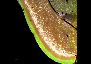 القشرة الكمثرية لفأر عمرن 14 يوماً (بالأخضر) stained for enkephalin (بالأحمر) and DAPI (بالأزرق) to show nuclei. Epifluorescence. | ||