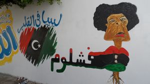 وقد تحولت الثورة في ليبيا إلى صراع مسلح وحرب أهلية. وانتهت تلك الحرب بأسر الزعيم الليبي معمر القذافي، وقتله في 20 أكتوبر 2011.[1] وقد زين الهجاء والسخرية الفنية من الزعيم الليبي سيئ السمعة شوارع ليبيا وجدرانها وأرضيتها.