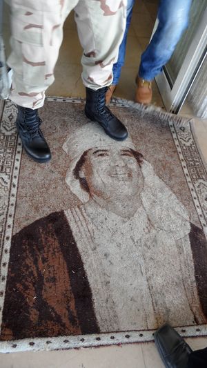 في الصورة إلى اليسار، يوجد جندي من الثوار يرتدي أحذية ثقيلة يقف على سجادة منسوجة عليها صورة للقذافي وضعت إستراتيجيًا عند عتبة الفندق.