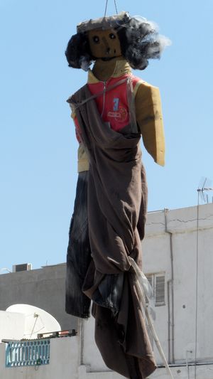 في شارع فشلوم الذي تصطف على جانبيه المحال، علقت التماثيل المصورة للقذافي في الطريق على مرأى من الناس على الأرصفة والسيارات. حيث يصور القذافي في ردائه الفضفاض، معلقًا من رقبته.