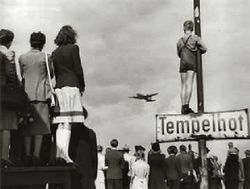 الألمان يراقبون طائرات الامدادات الغربية في مطار برلين تمپل‌هوف أثناء الجسر الجوي لبرلين.