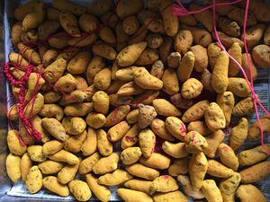 In Tamil Nadu and Andhra Pradesh, as a part of the Tamil–Telugu marriage ritual, dried turmeric tuber tied with string is used to create a Thali necklace. In western and coastal India, during weddings of the Marathi and Konkani people, Kannada Brahmins, turmeric tubers are tied with strings by the couple to their wrists during a ceremony, Kankana Bandhana.[29] In many Hindu communities, turmeric paste is applied to the bride and groom as part of pre-wedding festivities known as the haldi ceremony.[30]