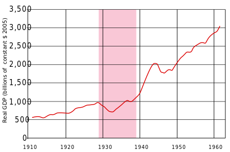 الأحداث الرئيسية | Wall Street Crash of 1929 Smoot-Hawley Tariff Act Widespread bank failures Hitler's rise to power Dust Bowl New Deal Recession of 1937–1938 Depopulation of the Great Plains | ||