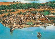 المستعمرون الإنجليز أسسوا المستوطنة الأولى الدائمة بمدينة جيمستاون بولاية فرجينيا في عام 1607م - والصورة توضح أحد معالم المدينة. وفي غضون المائة عام التالية أسس المستوطنون المستعمرات على امتداد ساحل المحيط.