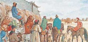 ماركو پولو، يبدو في الصورة في أقصى اليمين، وكان عمره حينذاك 17 عاما عندما وصل إلى الصين مع التجار الإيطاليين بقيادة والده نيقولا وعمه مافيو. ارتحل ماركو إلى الصين في أواخر القرن الثالث عشر الميلادي وألّف كتابًا مثيراً ضم كل خبراته وتجاربه.