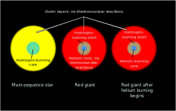 Once the supply of hydrogen at the core of a low-mass star with at least 0.25 M☉[8] is depleted, it will leave the main sequence and evolve along the red giant branch of the Hertzsprung–Russell diagram. Those evolving stars with up to about 1.2 M☉ will contract their core until hydrogen begins fusing through the pp chain along with a shell around the inert helium core, passing along the subgiant branch. This process will steadily increase the mass of the helium core, causing the hydrogen-fusing shell to increase in temperature until it can generate energy through the CNO cycle. Due to the temperature sensitivity of the CNO process, this hydrogen fusing shell will be thinner than before. Non-core convecting stars above 1.2 M☉ that have consumed their core hydrogen through the CNO process, contract their cores, and directly evolve into the giant stage. The increasing mass and density of the helium core will cause the star to increase in size and luminosity as it evolves up the red giant branch.[10]