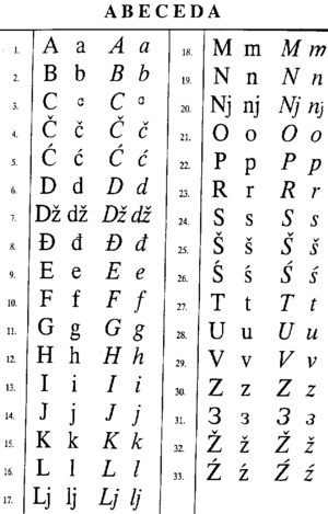 Latin | A | B | C | Č | Ć | D | Dž | Đ | E | F | G | H | I | J | K | L | Lj | M | N | Nj | O | P | R | S | Š | Ś | T | U | V | Z | Ž | Ź |