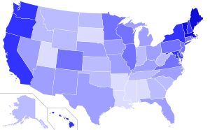 A 2015 Gallup poll found that socially liberal views have consistently been on the rise in the United States since 1999.[42] As of 2015, there is a roughly equal number of socially liberal Americans and socially conservative Americans (31% each) and the socially liberal trend continues to rise.[42] In early 2016, Gallup found that more Americans identified as ideologically conservative (37%) or moderate (35%) rather than liberal (24%), but that liberalism has slowly been gaining ground since 1992, standing at a 24-year high.[43]