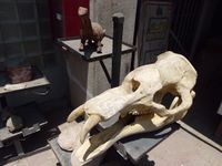 نموذج لجمجمة فيل ماقبل التطور وتمثال مصغر لديناصور من اكلة العشب ، في المتحف الجيولوجي المصري قام بهما الفنان مجدي ميخائيل مقار، سنة 2013. |