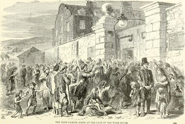 The Great Famine, also known as the Great Hunger (أيرلندية: an Gorta Mór []), the Famine and the Irish Potato Famine,[1][2] was a period of starvation and disease in Ireland lasting from 1845 to 1852 that constituted a historical social crisis and subsequently had a major impact on Irish society and history as a whole.[3] The most severely affected areas were in the western and southern parts of Ireland — where the Irish language was dominant — and hence the period was contemporaneously known in Irish as an Drochshaol,[4] which literally translates to "the bad life" and loosely translates to "the hard times". The worst year of the famine was 1847, which became known as "Black '47".[5][6] During the Great Hunger, roughly 1 million people died and more than 1 million more fled the country,[7] causing the country's population to fall by 20–25% (in some towns, populations fell as much as 67%) between 1841 and 1871.[8][9][10] Between 1845 and 1855, at least 2.1 million people left Ireland, primarily on packet ships but also on steamboats and barques—one of the greatest exoduses from a single island in history.[11][12]