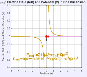 Illustration of the electric field surrounding a positive (red) and a negative (green) charge.