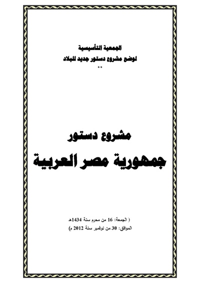 مسودة دستور مصر 2012، أصدرته اللجنة التأسيسية للدستور في 30 نوفمبر 2012، وصدق عليه الشعب بالاستفتاء المباشر الذي عقد في ديسمبر 2012. وأعلنت اللجنة المشرفة على الاستفتاء موافقة المصريين على مشروع الدستور بنسبة 63.8% ومعارضة 36.2،[1] صدق عليه الرئيس محمد مرسي في 26 ديسمبر 2012. وسوف يحل محل دستور 2012، الذي عُدل بعد قيام ثورة 25 يناير. في 1 ديسمبر 2012.[2][3]