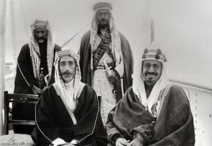 في جلسة مصالحة: الملك عبد العزيز آل سعود والملك فيصل بن الحسين ـ يتوسطان أعضاء مكتب المخابرات الانكليزي "المكتب الهندي"… الذين خلعوا الهاشميين وعيّنوا السعوديين وأصلحوا بينهم!….