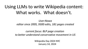 - ^ For example, someone skilled at dealing with vandalism but doing very little article work should probably not start creating articles using LLMs. Instead, they should first gather actual experience at article creation without the assistance of the LLM.