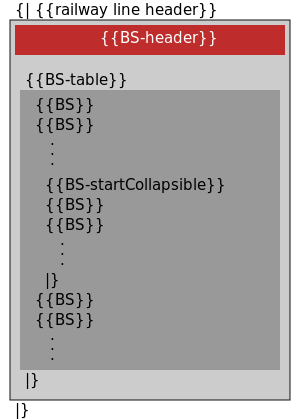 The real meat of designing the map. The number n after the template name BS (German abbreviation of Bahnstrecke for stretch of track) indicate how many horizontal icon grids available. Use these templates with icon images continuously on every new row to construct the map.