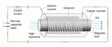 The most powerful manmade magnetic fields[27] have been created by using explosives to compress the magnetic field inside an electromagnet as it is pulsed; these are called explosively pumped flux compression generators. The implosion compresses the magnetic field to values of around 1000 T[25] for a few microseconds. While this method may seem very destructive, it is possible to redirect the brunt of the blast radially outwards so that neither the experiment nor the magnetic structure are harmed. These devices are known as destructive pulsed electromagnets.[28] They are used in physics and materials science research to study the properties of materials at high magnetic fields.