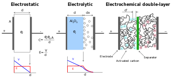 فى المكثف المعتاد, ويتم تخزين الطاقة من خلال إزالة حاملات الشحنة, أى الإليكترونات من, من القطب المعدنى ووضعه على القطب الآخر. وهذا الفصل بين الشحنة يفسح المجال لفرق في الجهد يظهر بين القطبين , والتي يمكن تسخيرها في الدائرة الخارجية. و كان مجموع الطاقة المخزنة على هذا النحو يتناسب مع كلا من عدد الشحنات المخزنة و فرق الجهد بين القطبين. و الأول يعبر أساسا عن معادلة بين الحجم , خواص مادة القطبين , و الأخير يكون محدودا بسبب العزل التحطم بين القطبين. المواد المختلفة التي تقع بين لوحات للفصل بينهما ينتج عنها فرق غى الجهد مختلف ينبغى تخزينه. البحث عن مواد مثلى يؤدي إلى ارتفاع كثافة الطاقة لأي حجم مكثف. In contrast with traditional capacitors, electric double-layer capacitors do not have a conventional dielectric. Rather than two separate plates separated by an intervening substance, these capacitors use "plates" that are in fact two layers of the same substrate, and their electrical properties, the so-called "electrical double layer", result in the effective separation of charge despite the vanishingly thin (on the order of nanometers) physical separation of the layers. The lack of need for a bulky layer of dielectric permits the packing of "plates" with much larger surface area into a given size, resulting in their extraordinarily high capacitances in practical sized packages.
