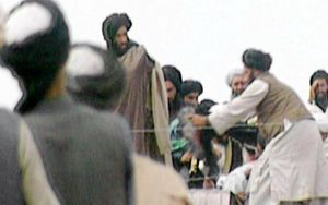 A still from a 1996 video taken secretly by BBC Newsnight. It purports to show Omar presenting the cloak of Muhammad to his troops in Kandahar, before their victorious assault on Kabul.