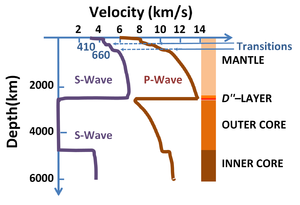 سرعات الموجات الزلزالية في عمق الأرض.[2] The negligible S-wave velocity in the outer core occurs because it is liquid, while in the solid inner core the S-wave velocity is non-zero.