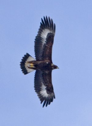 عقاب ذهبية يافعة، لاحظ بياض الذيل ووجود بعض الريشات ذات الأطراف البيضاء على كتفيها.