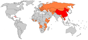 الدول الشيوعية الماركسية اللنينية (باللون الأحمر) والدول الشيوعية السابقة )باللون البرتقالي).