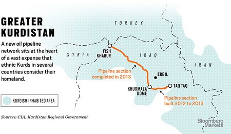 خريطة توضح مسار خط أنابيب النفط الكردي[8].