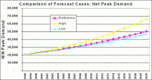 ونظراً لانخفاضِ أسعارِ الطاقة نسبياً فقد كانَ الطلبُ على الكهرباء في المملكة غير مقيد في الماضي، أي أنّه لا يوجد نظام تحكم بأسعارِ الطاقة وحيث لم تدخل مفاهيم ترشيد الطاقة آنذاك. وقد بلغت ذروة الطاقة المستهلكة واقتربت إلى حدٍّ كبير من حجمِ القدرةِ المركّبة في عام 1999م ممّا أدّى إلى انقطاعِ الكهرباء في فترات معينة من صيفِ ذلك العام، وقد ازدادَ الطلبُ على الطاقة ازدياداً غير متوقع مما تسبّب ذلك إلى مضاعفةِ الطلب على الكهرباء بمعدّل رقمين متتاليين في الزيادة السنوية، وبنفس الأسلوب ارتفعت ذروة استهلاك الطاقة بنفس الزيادة السابقة، أنظر إلى الجدولِ المرفق وشكل (1). وعلى أية حالٍ في الخمس سنوات الماضية ارتفعت أسعارُ الطاقة بمعدّل أكثر من 30٪ لكل من النفطِ ومشتقاته والكهرباء معاً، وهذا بدورهِ أدّى إلى التفكيرِ جدياً في تشجيعِ مفاهيم المحافظة على الطاقة وترشيدها. يوضحُ شكل (2) ثلاث تنبؤات (سيناريوهات) للطاقة تتمثلُ بالطلب الذروي (ميجاوات) حتى عام 2020م وذلك استناداً إلى نتائجِ الدراسة التي صدرت مؤخراً عن معهد تل آس " Tellus " وفريق سعودي من إدارةِ / أقسام تخطيط الطاقة الكهربائية، حيث أنّ معظم التنبؤات السابقة لِنُمُوّ الطلبِ على الطاقة في الفترة 1999م إلى 2004م أعطت النتائجُ التالية:
