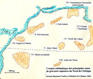The rock engravings of Oued Djerat, located in the Tassili n'Ajjer, Algeria, and dated to the Neolithic period, have many affinities with those of the South Oranese (Algeria) and the Fezzan (Libya). According to Henri Lhote, they date back more than 7000 years.[1]