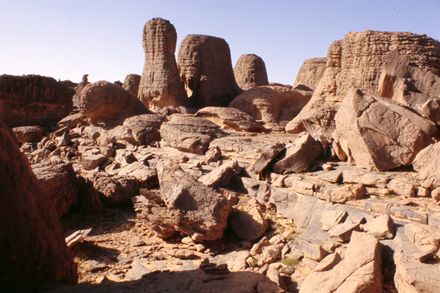 The Djerat wadi is a cañon dug in the Tassili siluro-devonian sandstones which runs between very steep cliffs. It flows into the valley of Illizi, about a hundred kilometers from the Libyan border. The wadi is on average 200 meters wide, its cliffs varying from 25 to 30 meters high at the outlet, reaching 150 meters towards the palm grove of Nafeg and reducing towards its sources. It receives many tributaries, including the wadis Afar and Assahor, which provide a large volume of water at the time of rains.[7] The two banks of the wadi are covered with engravings over a distance, according to the maps published by Lhote in his work, of nearly twenty kilometers.