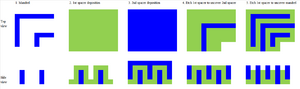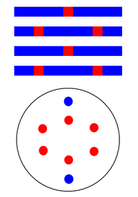 In DRAM, the array and periphery are exposed at different illumination conditions. For example, the array could be exposed with dipole illumination while the periphery could use annular illumination.[25] This situation applies to any set of patterns (half-pitch < 0.5 λ/NA) with different pitches or different feature arrangements, e.g., rectangular arrays vs. staggered arrays.[26][27][28][29] Any of the individual patterns is resolvable, but a single illumination cannot be used simultaneously for all of them. A minimum pitch may require an illumination that is detrimental to twice the minimum pitch with defocus.[30][31]