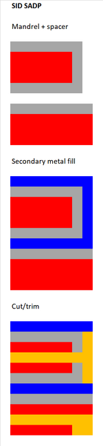 Self-aligned triple patterning has been considered as a promising successor to SADP, due to its introduction of a second spacer offering additional 2D patterning flexibility and higher density.[76][77] A total of two masks (mandrel and trim) is sufficient for this approach.[78] The only added cost relative to SADP is that of depositing and etching the second spacer. The main disadvantage of SATP succeeding SADP is that it would only be usable for one node. For this reason, self-aligned quadruple patterning (SAQP) is more often considered. On the other hand, the conventional SID SADP flow may be extended quite naturally to triple patterning, with the second mask dividing the gap into two features.[79]