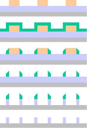 The main issues with the spacer approach are whether the spacers can stay in place after the material to which they are attached is removed, whether the spacer profile is acceptable, and whether the underlying material is attacked by the etch removing the material attached to the spacer. Pattern transfer is complicated by the situation where removal of the material adjacent to the spacers also removes a little of the underlying material. This results in higher topography on one side of the spacer than the other.[50] Any misalignment of masks or excursion in pre-patterned feature critical dimension (CD) will cause the pitch between features to alternate, a phenomenon known as pitch walking.[51]