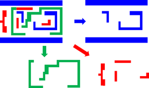 The method of complementary exposures[81] is another way of reducing mask exposures for multiple patterning. Instead of multiple mask exposures for individual vias, cuts or blocks, two exposures of opposing or complementary polarity are used, so that one exposure removes interior portions of the previous exposure pattern. The overlapped regions of two polygons of opposite polarity do not print, while the non-overlapped regions define locations that print according to the polarity. Neither exposure patterns the target features directly. This approach was also implemented by IMEC as two "keep" masks for the M0A layer in their 7nm SRAM cell.[82]