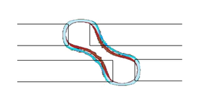It is well-established that dense two-dimensional patterns, which are formed from the interference of two or three beams along one direction, as in quadrupole or QUASAR illumination, are subject to significant rounding, particularly at bends and corners.[11][12][13] The corner rounding radius is larger than the minimum pitch (~0.7 λ/NA).[14] This also contributes to hot spots for feature sizes of ~0.4 λ/NA or smaller.[15] For this reason, it is advantageous to first define line patterns, then cut segments from such lines accordingly.[16] This of course, requires additional exposures. The cut shapes themselves may also be round, which requires tight placement accuracy.[16][17][18]