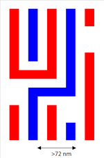 Much progress had been reported on the use of PMMA-PS block copolymers to define sub-20 nm patterns by means of self-assembly, guided by surface topography (graphoepitaxy) and/or surface chemical patterning (chemoepitaxy).[68] The key benefit is the relatively simple processing, compared to multiple exposures or multiple depositions and etching. The main drawback of this technique is the relatively limited range of feature sizes and duty cycles for a given process formulation. Typical applications have been regular lines and spaces as well as arrays of closely packed holes or cylinders.[69] However, random, aperiodic patterns may also be generated using carefully defined guiding patterns.[70]