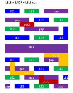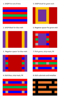Self-aligned blocking or cutting is currently being targeted for use with SAQP for sub-30 nm pitches.[83] The lines to be cut are divided into two materials, which can be etched selectively. One cut mask only cuts every other line made of one material, while the other cut mask cuts the remaining lines made of the other material. This technique has the advantage of patterning double pitch features over lines at the minimum pitch, without edge placement errors.[37] Cut-friendly layouts are processed with the same minimum number of masks (3), regardless of using DUV or EUV wavelength.[84]