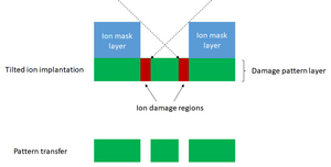 Tilted ion implantation was proposed in 2016 by the University of Berkeley as an alternative method of achieving the same result as spacer patterning.[80] Instead of core or mandrel patterns supporting deposited spacers, an ion masking layer pattern shields an underlying layer from being damaged by ion implantation, which leads to being etched away in a subsequent process. The process requires the use of angled ion beams which penetrate to just the right depth, so as not to damage already processed layers underneath. Also, the ion masking layer must behave ideally, i.e., blocking all ions from passing through, while also not reflecting off the sidewall. The latter phenomenon would be detrimental and defeat the purpose of the ion masking approach. Trenches as small as 9 nm have been achieved with this approach, using 15 keV Ar+ ion implantation at 15-degree angles into a 10 nm thermal SiO2 masking layer. A fundamental aspect of this approach is the correlation between damage width and damage pitch; both widen at the same time for fixed ion mask height and ion beam angle.