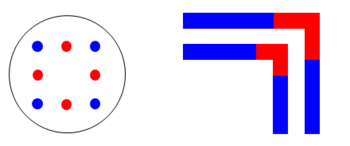 For the specific case of hole arrays (minimum half-pitch < 0.6 λ/NA), three well-known cases require three entirely different illuminations. A regular array generally requires Quasar illumination, while the same array rotated 45 degrees results in a checkerboard array that requires C-quad illumination.[29] Different from both cases, an array with close to triangular or hexagonal symmetry requires hexapole illumination.[34]