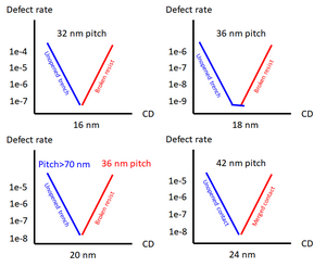 Stochastic defects, including edge placement error, also entail double (or higher) patterning for contacts/vias with center-to-center distance of 40 nm or less.[98][99]