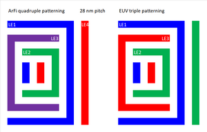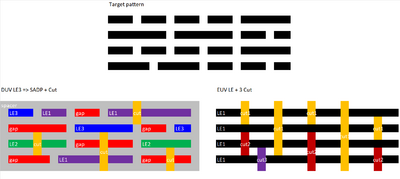 The underlying situation is that EUV patterns may be split according to different illuminations for different pitches, or different pattern types (e.g., staggered arrays vs. regular arrays).[88] This could apply to line-cutting patterns as well as contact/via layers. It is also likely more than one cut would be needed, even for EUV.[93]